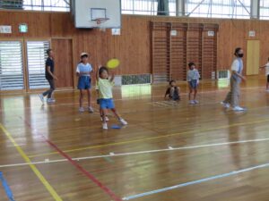 相手が取りやすい様に投げるのもポイント、声を掛け合いながら夢中になってディスクを投げている姿がとても印象的でした。