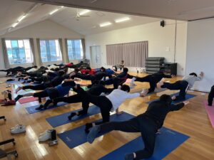 そして後半は・・・横澤先生によるリラックスヨガの体験。ヨガのさまざまなポーズから、身体の動かし方のバリエーションの豊富さを学びつつ、筋が伸ばされることによって感じる身体のリラックス感を感じられたのではないでしょうか?