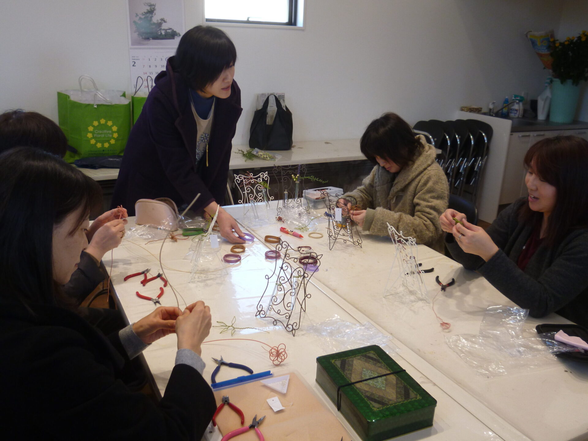 サンキャッチャーやクリスマスオーナメントなど、季節にあわせて雑貨を作ってきましたが、今回最後の講座では、立て型一輪差しを今年流行りのカラーワイヤーを使って作りました。