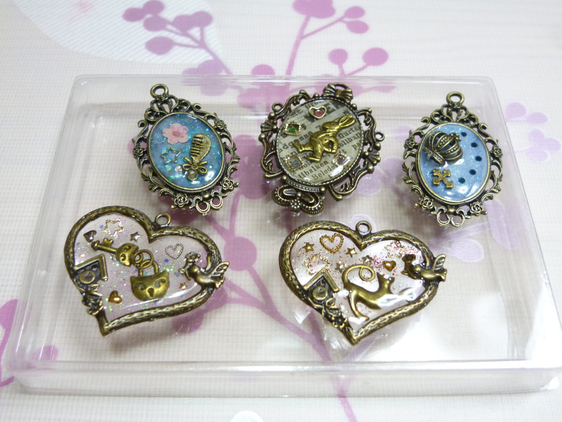 それぞれ好みの台座に英字新聞やいろんな色のネイルで下地を作り 花やビーズや銅型のウサギやハートなど組み合わせて
