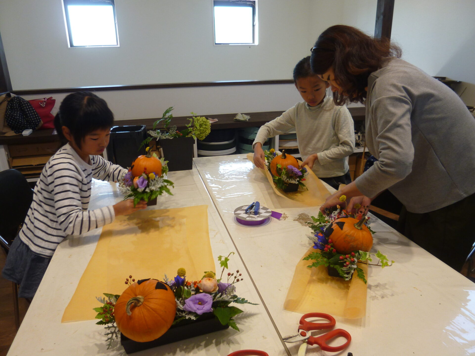 第1回目は、ハロウィンということで、目と口をつけたカボチャを使って、まわりを花で飾り、卓上用の作品を