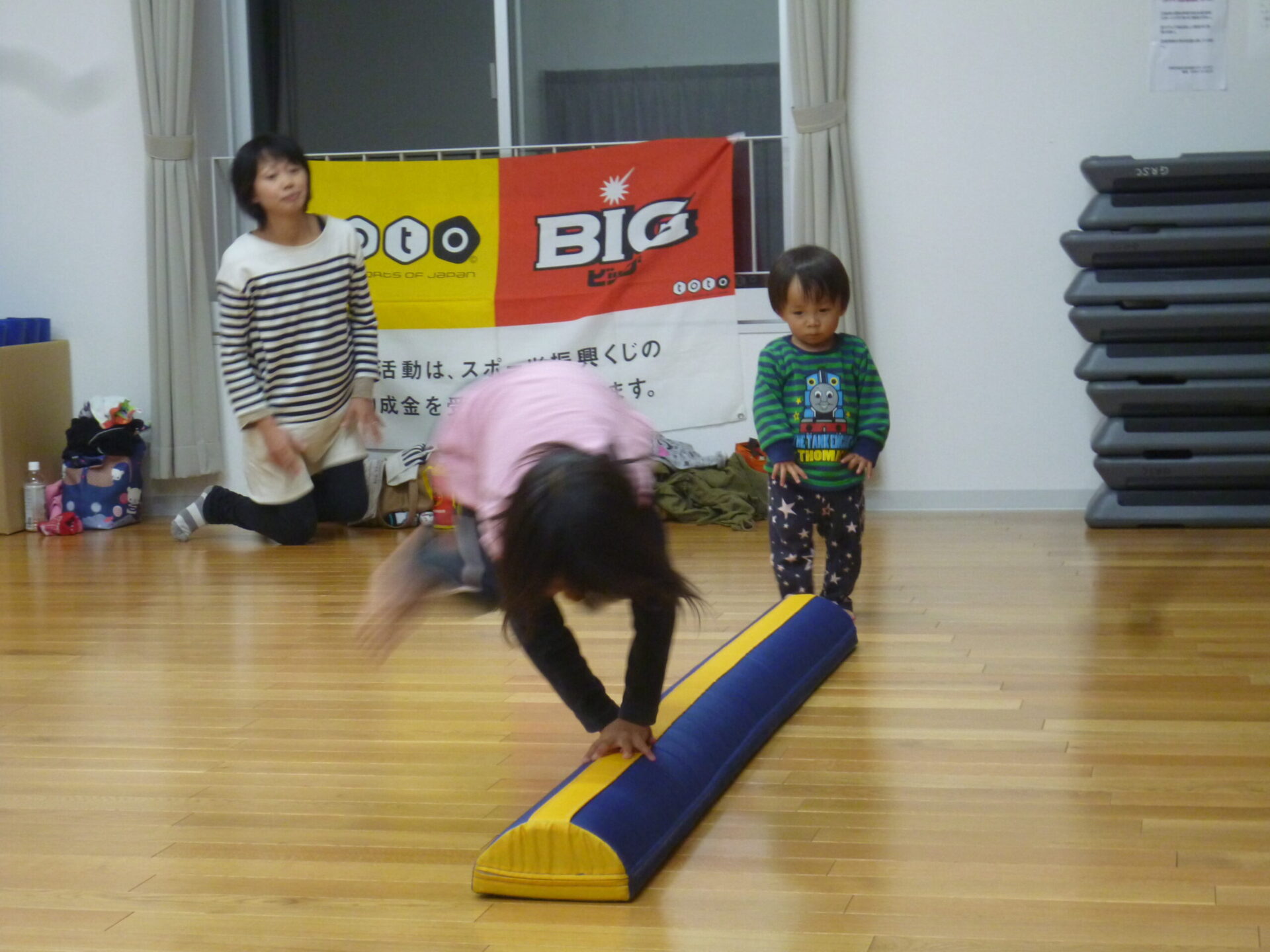 最終日は、ドキドキの発表会・・・。 前転、側転、バランスを一人一人発表しました。 お母さんから沢山の拍手をもらって、とても嬉しそうでした。