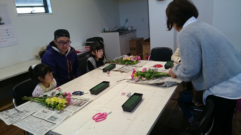 親子でフラワーアレンジに挑戦しています。