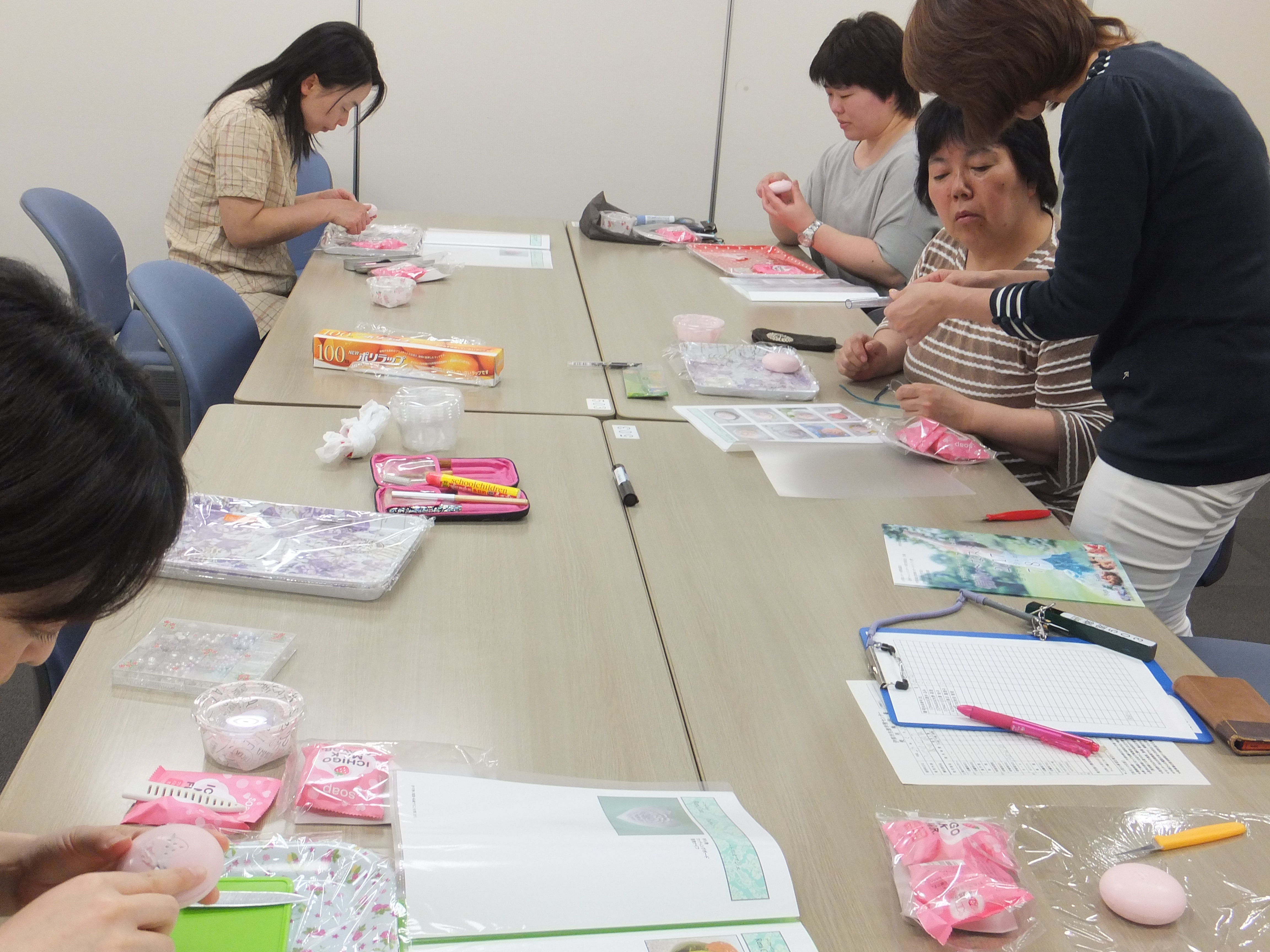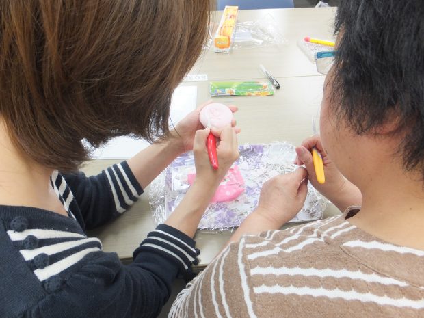 5人の受講生の1人は3年目で、石鹸をハートに削りハートフラワーを、