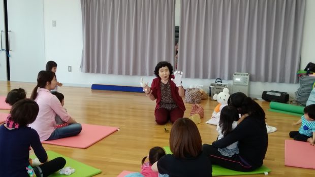 くまさんのぬいぐるみと一緒に洋子先生の歌に合わせて体を動かしたり、季節に合わせた絵本や、動物の絵と先生ぴょ~んという声につられて自然に体が動いてしまうお話など・・・