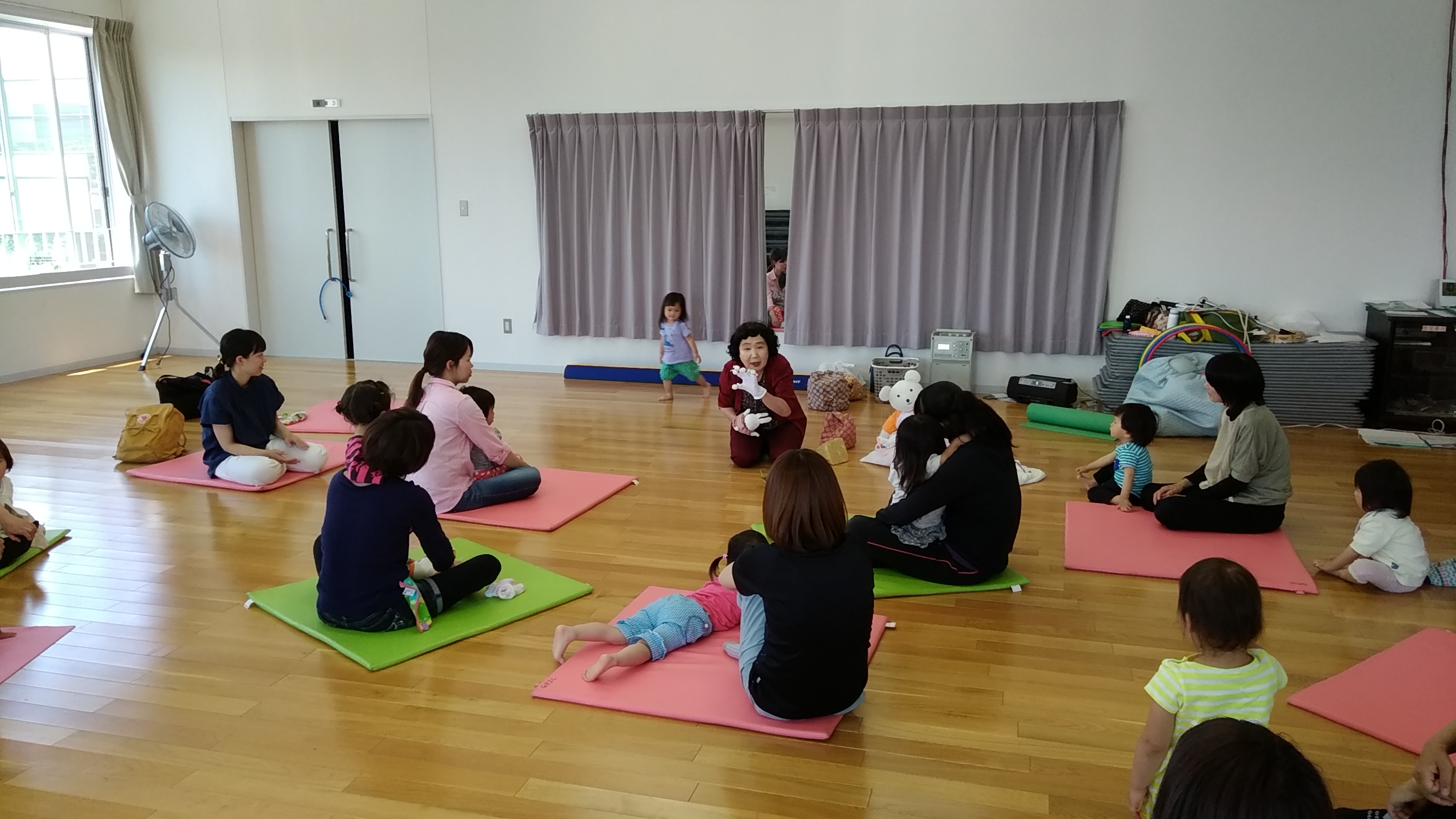 くまさんのぬいぐるみと一緒に洋子先生の歌に合わせて体を動かしたり、季節に合わせた絵本や、動物の絵と先生ぴょ~んという声につられて自然に体が動いてしまうお話など・・・