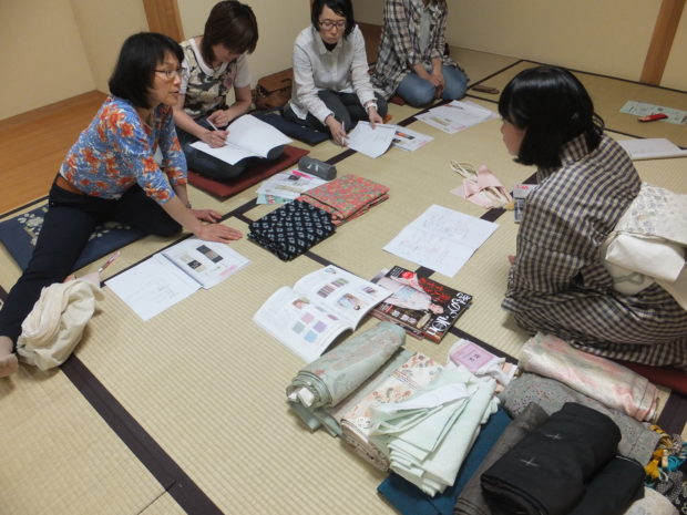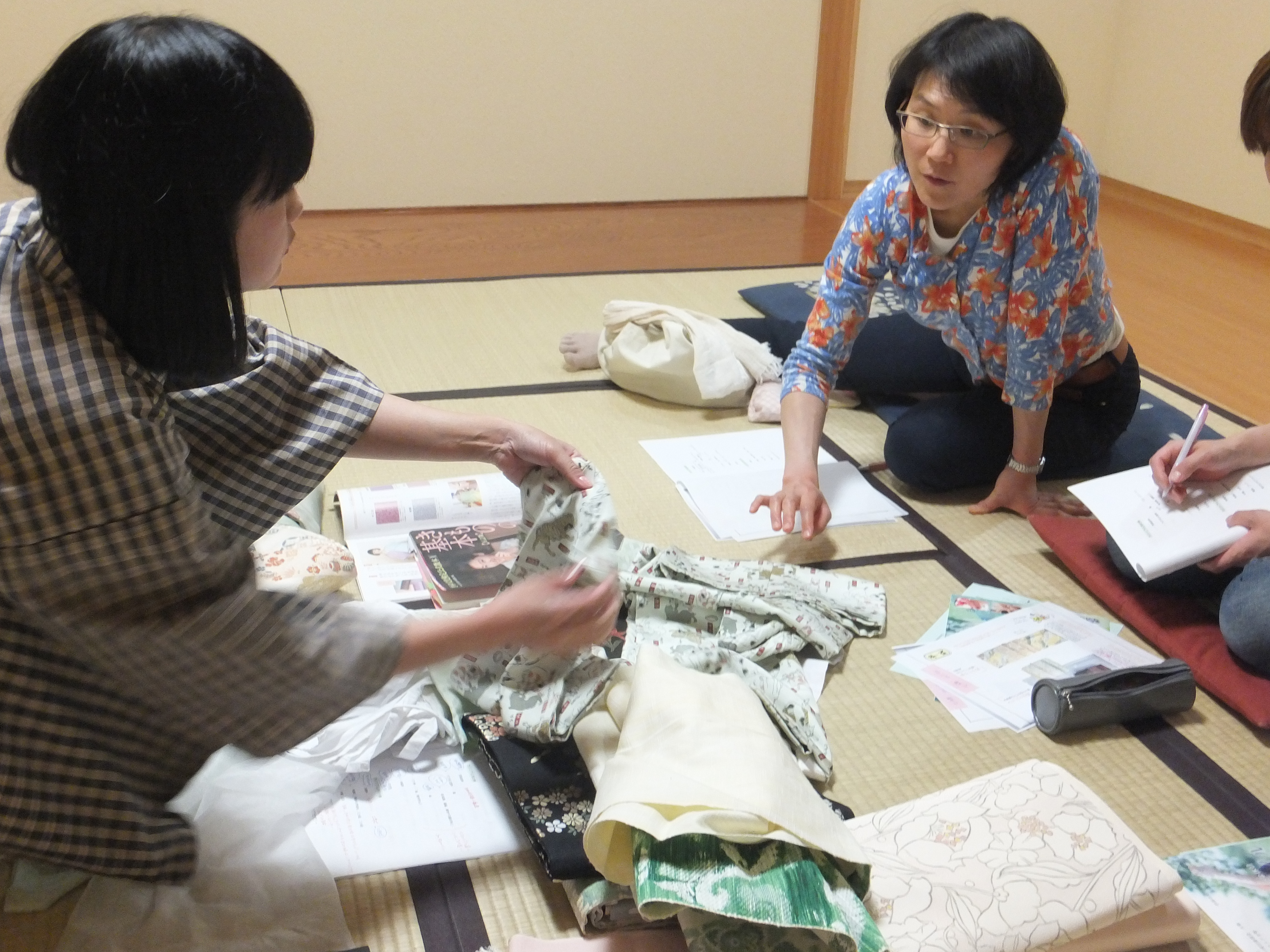 初回の今回は、着物を知ろうということで先生ご自身がお持ちの着物を持って来て下さり、直接着物にさわりながら、留袖や付け下げのようなフォーマルな着物から小紋や紬などカジュアルな着物までの格や帯などの合わせ方などを、洋装のワンピースやジーパンにたとえながらわかりやすく教えて下さいました。