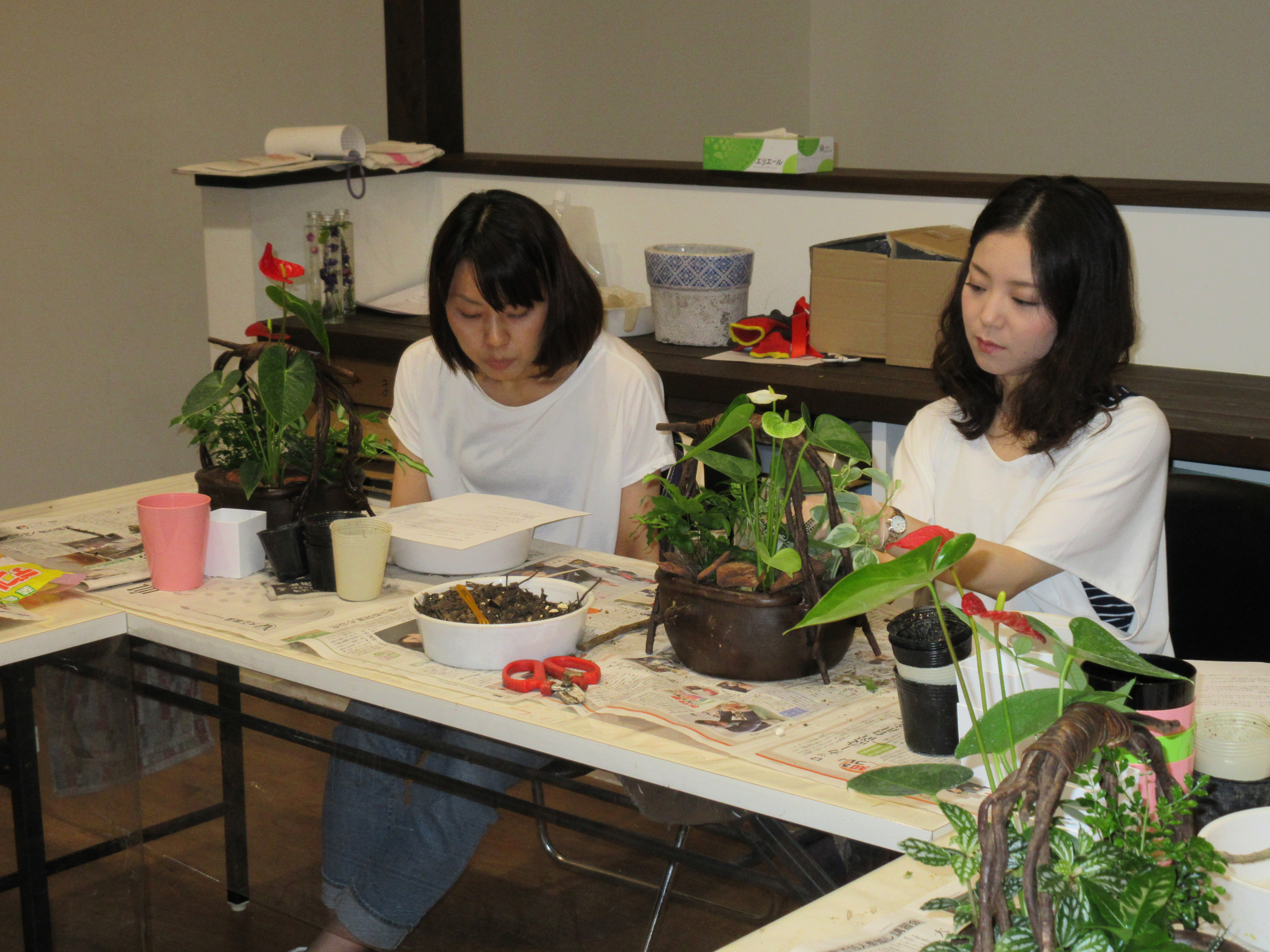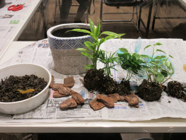 植物が決まれば土の配合をし、鉢の中に選んだ植物と土を入れ仕上げました。