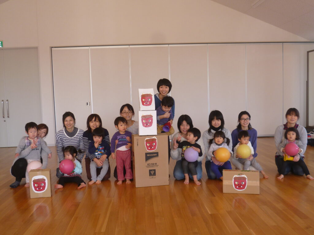 今日の親子ふれあいスキンシップ体操は、みんなで元気いっぱい鬼退治をしました。 小さな鬼、大きな鬼にボールをぶつけて退治します ...